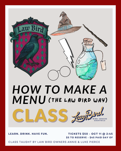 Join us to learn all about making A Cocktail Menu - taught by Law Bird Owners Annie & Luke Pierce! We'll be taking a deep dive into how Law Bird takes a menu theme, in this case we'll be using Harry Potter as an example, and creates unique cocktails and a balanced menu.